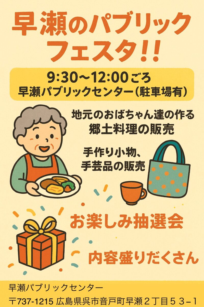 早瀬のパブリックフェスタ!11/30(日)9:30~12:00ごろ 25.11.17 地元早瀬住民が,小イワシの天ぷら,もぶりめし,大豆団子うどんなど, 郷土料理を販売!手作り小物,抽選会など、内容盛りだくさん!